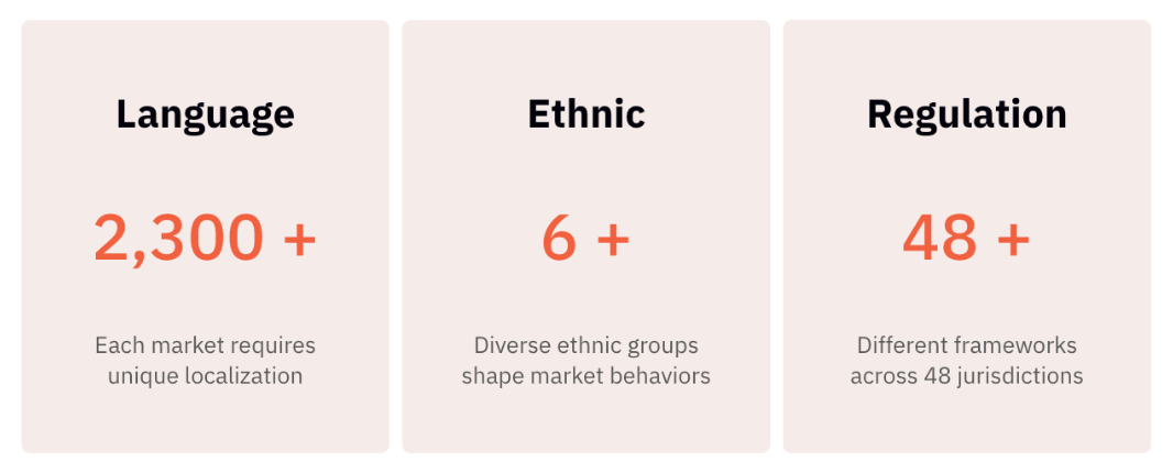 아시아 시장을 이해하기 위해서는 이들 시장이 가진 다양성과 복잡성을 이해할 필요가 있다. 아시아 시장은 2,300개 이상의 언어, 6개 이상의 서로 다른 지역권(동북아·동남아·서남아 등), 48개 이상의 관할권별 서로 다른 규제 프레임워크가 존재하는 복합적인 시장이다. 각국은 독자적인 문화를 발전시켜 왔으며, 같은 아시아권 국가들 사이에서도 뚜렷한 차이를 보인다. 때로는 서구권과의 차이보다 아시아 국가 간 차이가 더 두드러지기도 한다.