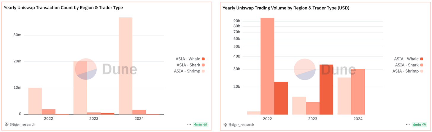 더욱 주목할 만한 점은 아시아 지역 내 투자자 유형별 참여율의 변화다. 거래 규모에 따라 고래($100,000 이상), 상어($10,000-100,000), 새우($10,000 미만)로 구분하였을 때, 의미 있는 변화가 관찰된다. 2021년에는 새우 투자자의 거래량이 적은 부분을 차지하였으나 이들의 트랜잭션 수나 거래량이 2024년으로 갈수록 비중이 꾸준히 증가하고 있는 추세이다. 이러한 변화는 아시아 시장 내 사용자들이 CEX 뿐만 아니라 DEX로 참여하며 웹3 서비스 활용의 저변이 확대되고 있음을 보여주는 긍정적인 신호다.