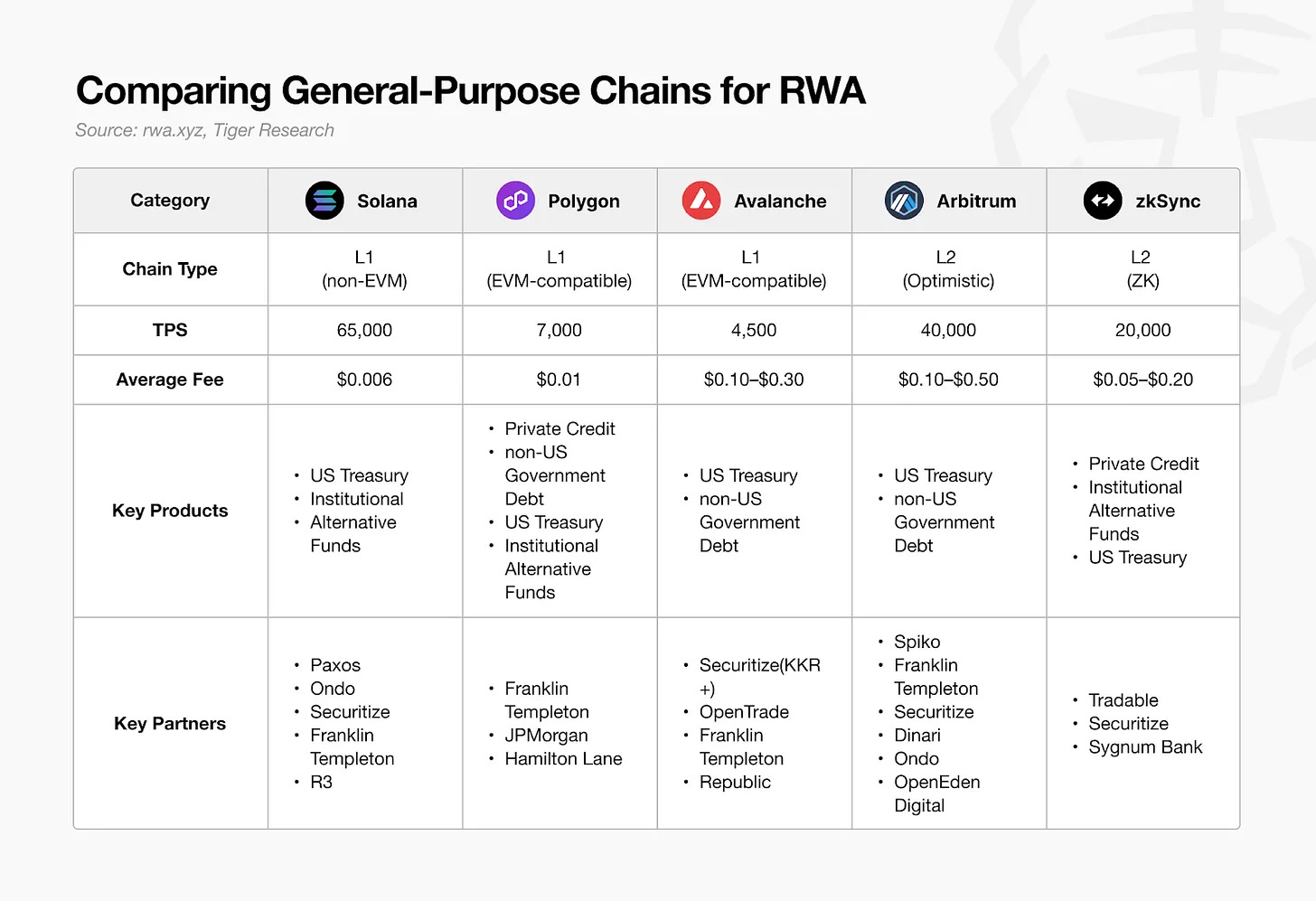 然而,具有更快、更便宜交易的通用区块链,以及为符合监管要求而设计的RWA专用链,正在解决以太坊在成本和性能上的限制。这些新兴平台通过提供卓越的技术可扩展性或内置的合规功能,正将自己定位为下一代基础设施。