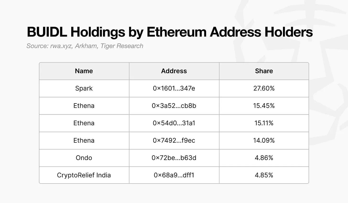 这一点在Ondo、Spark和Ethena等平台上显而易见,它们都在以太坊上持有大量的代币化BUIDL基金。这些平台通过提供基于代币化美国国债的产品、基于稳定币的借贷以及合成生息美元工具,吸引了数亿美元的资金。