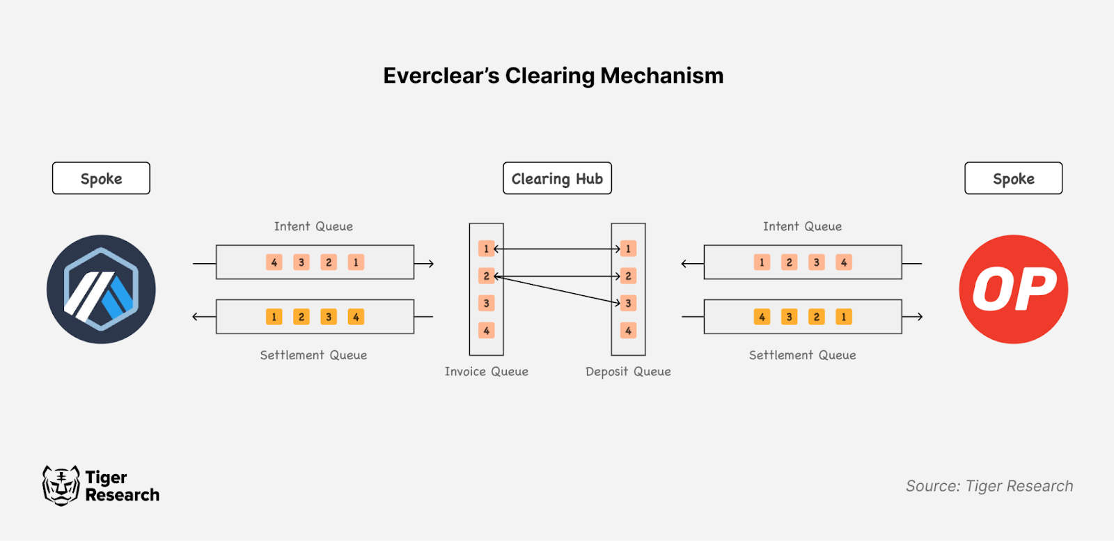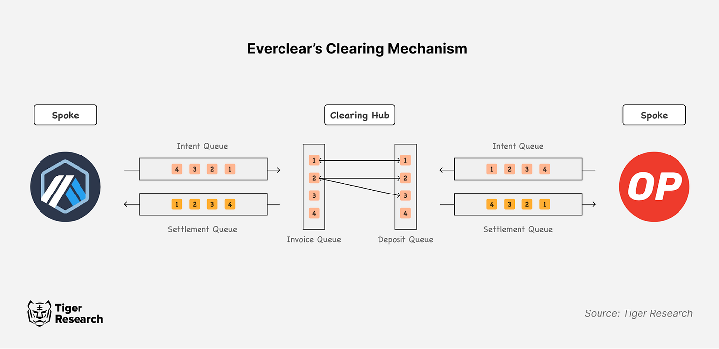 에버클리어의 클리어링 매커니즘은 허브 앤 스포크(Hub&Spoke) 모델을 기반으로 작동한다. 이더리움(Ethereum), 아비트럼(Arbitrum), 옵티미즘(Optimism) 등 메인넷은 스포크에 해당하며, 클리어링 레이어인 에버클리어는 허브로서 이들의 트랜잭션을 취합해 상계 처리 한다.