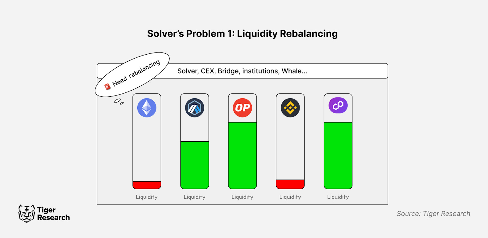 유동성 리밸런싱 문제는 비단 솔버에게만 국한되지 않고 생태계 전반에 걸친 문제이기도 하다. 가상자산 거래소(CEX)는 사용자들의 거래, 그리고 출금으로 인한 자산 유출로 인해 지속적인 리밸런싱 작업이 필수적이다. 더불어, 자금 교환이 빈번히 일어나는 브릿지 서비스, 대규모 거래를 수행하는 마켓 메이커와 고래 투자자들 역시 유동성 관리 문제에 직면한다.