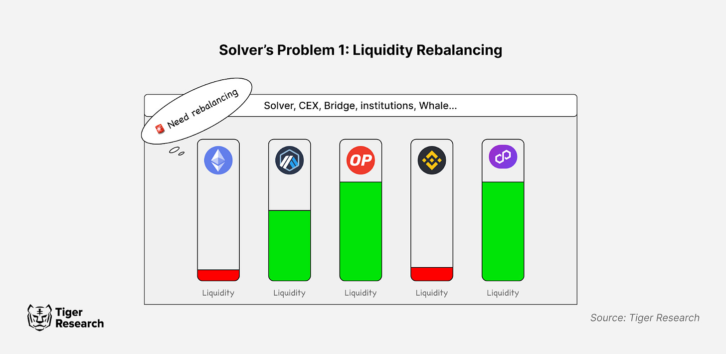 솔버는 주로 두 가지 문제에 직면한다. 첫 번째는 유동성 리밸런싱(Liquidity Rebalancing) 문제다. 이는 솔버가 사용자를 대신해 멀티 체인 간 자산 이동을 수행하는 과정에서 발생한다. 시간이 지남에 따라 솔버의 자산 분포가 초기 설정한 비율에서 벗어나 특정 체인에 유동성이 쏠리는 현상이 나타난다. 이러한 불균형을 해소하기 위해 솔버는 주기적으로 리밸런싱 작업을 수행해야 하지만, 이 과정에서 시간과 비용이 소요되어 운영상의 부담이 된다. 이는 솔버의 효율성과 수익성에 직접적인 영향을 미치며, 궁극적으로 사용자 경험에도 영향을 줄 수 있다.