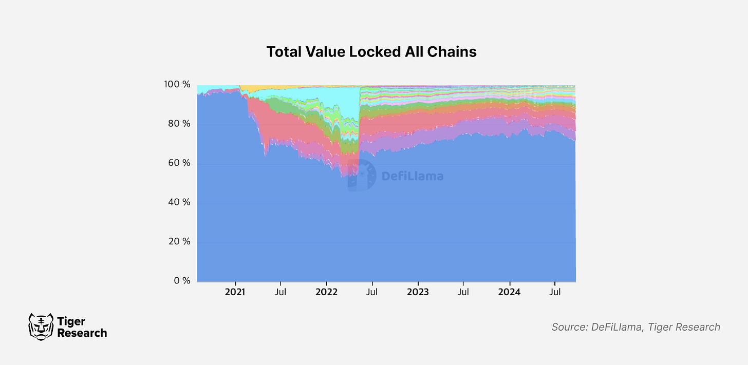 유동성의 파편화 또한 중요한 문제이다. 웹3 산업은 본질적으로 정보 기술(Information Technology) 레이어에 금융(Financial) 레이어를 결합한 산업이기에 유동성이 핵심 요소로 작용하기 때문이다. 유동성의 파편화는 사용자들에게 불편한 거래 경험을 주며, 이는 산업 전반의 성장을 저해하는 요인이 된다. 특히, 2021년 이후 웹3 산업 내 체인의 수가 급증하면서 유동성 파편화 현상은 더욱 두드러지고 있는 실정이다.