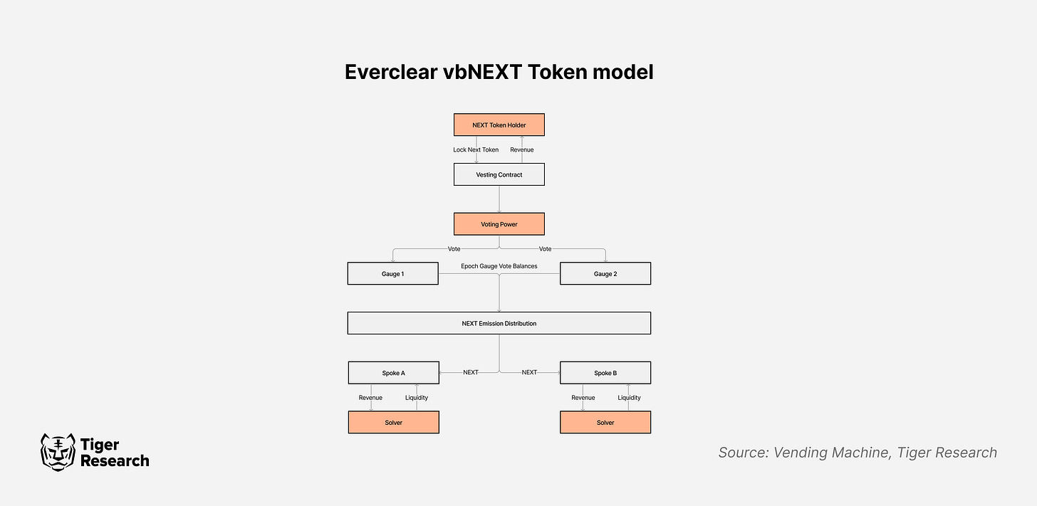 vbNEXT 토큰 모델의 핵심은 활용도가 낮은 체인이나 경로에 유동성을 공급하는 것이다. 토큰 홀더는 NEXT 토큰 스테이킹을 통해 양도 불가능한 vbNEXT 토큰을 획득한다. 이는 각 에포크(Epoch)마다 특정 체인(스포크)에 투표할 수 있는 '투표권'이다.