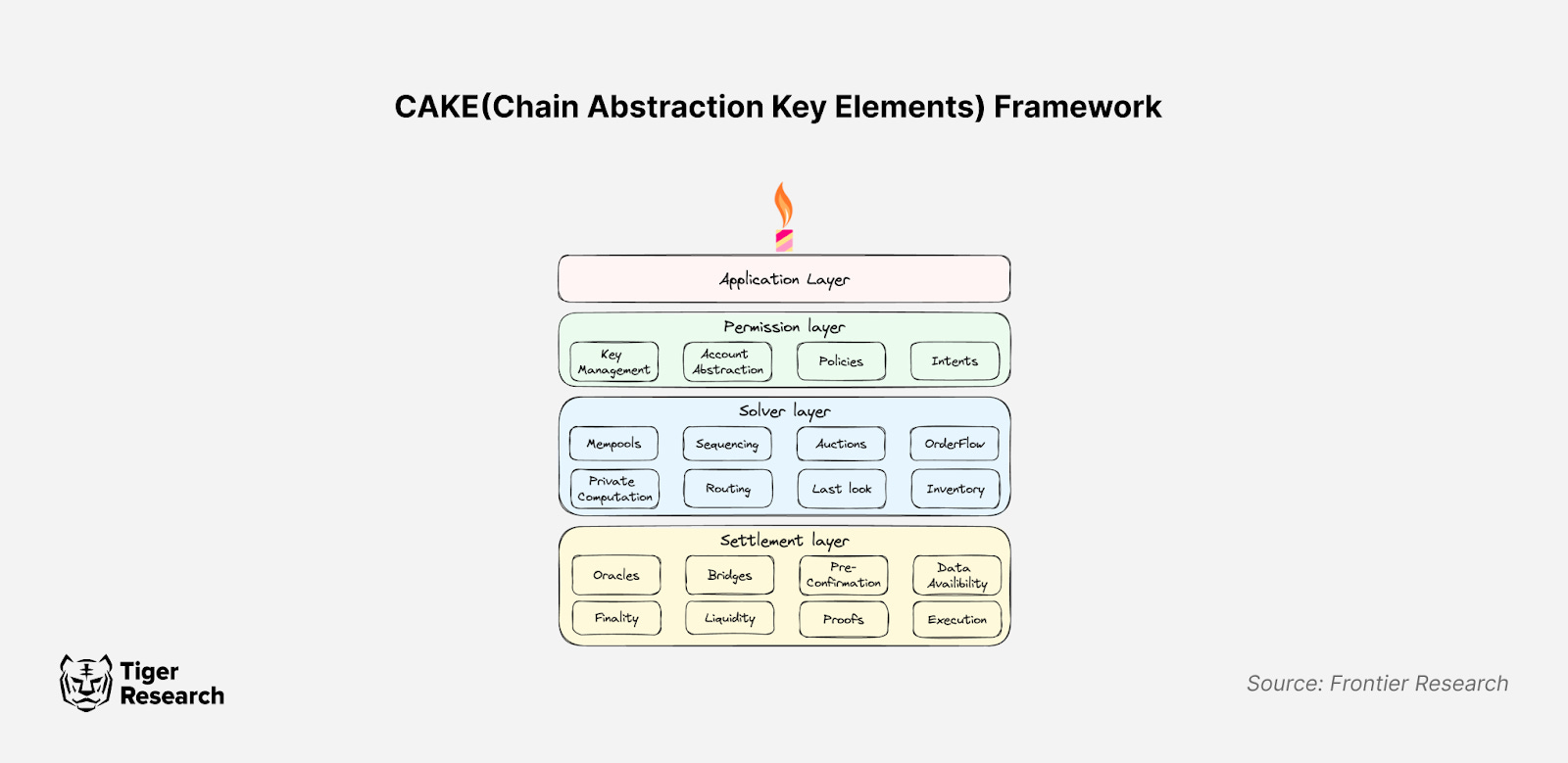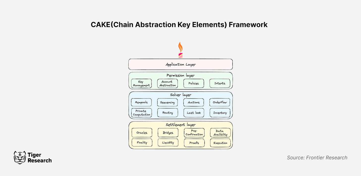 체인 추상화 기술은 CAKE(Chain Abstraction Key Elements) 프레임워크로 구체화되며, 1) 퍼미션 레이어(Permission Layer), 2) 솔버 레이어(Solver Layer), 3) 세틀먼트 레이어(Settlement Layer)라는 세 가지 레이어로 구성된다.