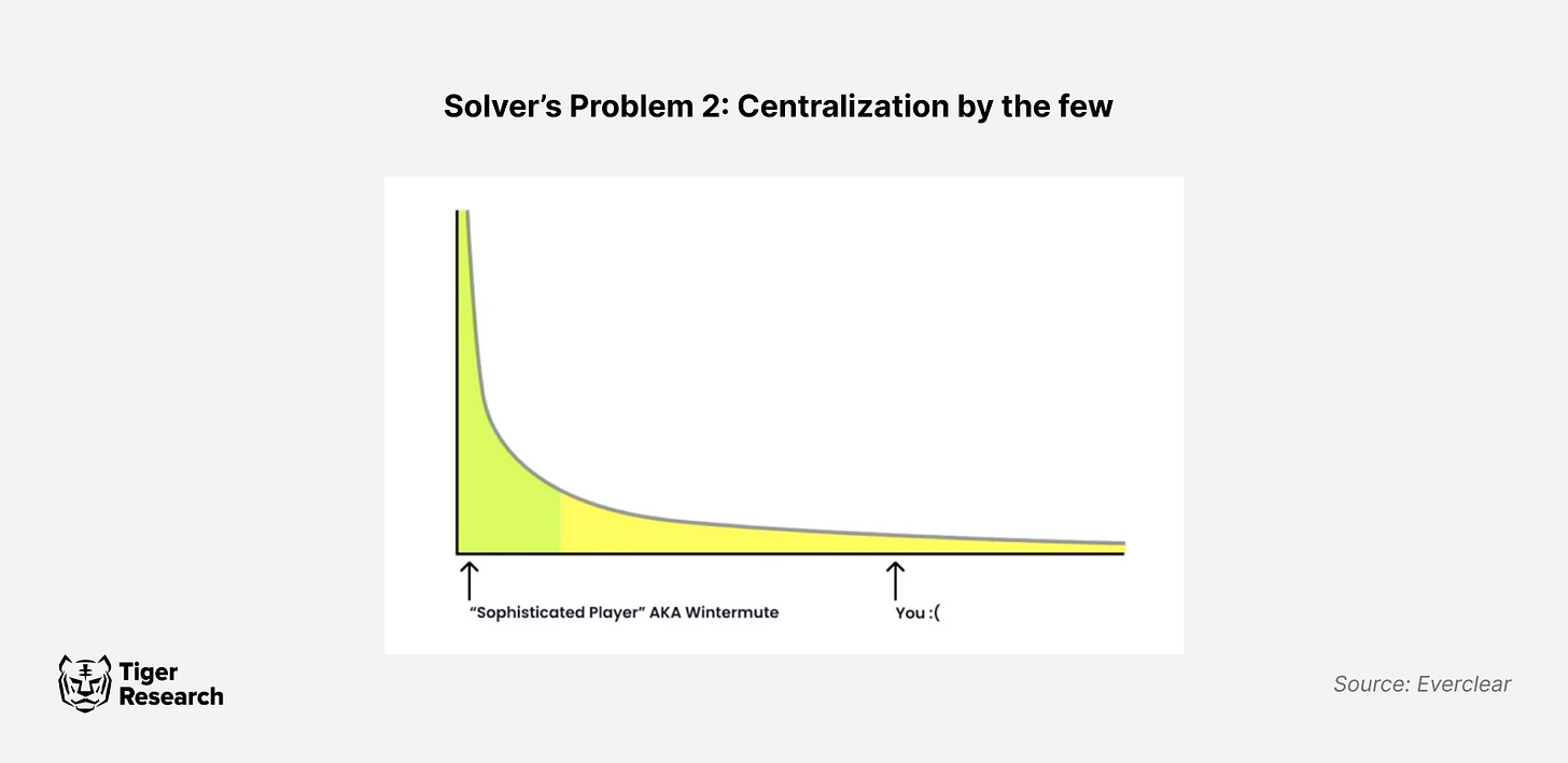 두 번째는 유동성 리밸런싱 문제에서 파생된 솔버의 중앙화 위험이다. 대규모 자산을 보유한 솔버들은 유동성 리밸런싱 문제를 비교적 쉽게 해결할 수 있다. 하지만 소규모 솔버들은 리밸런싱에 있어 시간적, 비용적 제약에 직면한다. 이로 인해 자본력이 큰 소수의 솔버들이 시장에서 우위를 점하게 되며, 결과적으로 생태계의 중앙 집중화를 초래할 가능성이 높다. 이는 산업 전반에 걸쳐 네트워크 취약성을 높이고, 소수에 의한 가격 왜곡과 시장 불균형 발생 위험을 높일 수 있어 대응책 마련이 필요하다.
