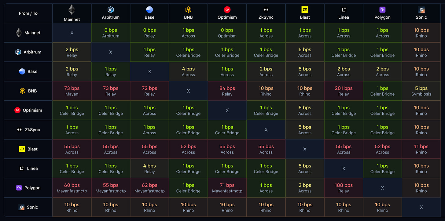 가장 큰 문제는 파편화다. 각 플레이어가 서로 다른 체인을 구축하면서 현재 블록체인 산업에는 400여 개가 넘는 체인이 존재하게 되었다. 이러한 파편화된 환경에서는 세 가지 문제가 동시에 발생한다. 첫 번째로, 유동성이 체인별로 분산되어 자본 효율성이 떨어진다. 두 번째로, 운영 복잡성이 기하급수적으로 증가한다는 것이다. 마지막으로, 체인 간 자산 이동 시 브릿지를 거쳐야 하며 이 과정에서 높은 수수료가 발생한다. 에버클리어(Everclear) 팀의 리밸런싱 대시보드에 따르면, 특정 체인 간 이동 수수료는 300bps 이상에 달하는 것으로 확인된다.