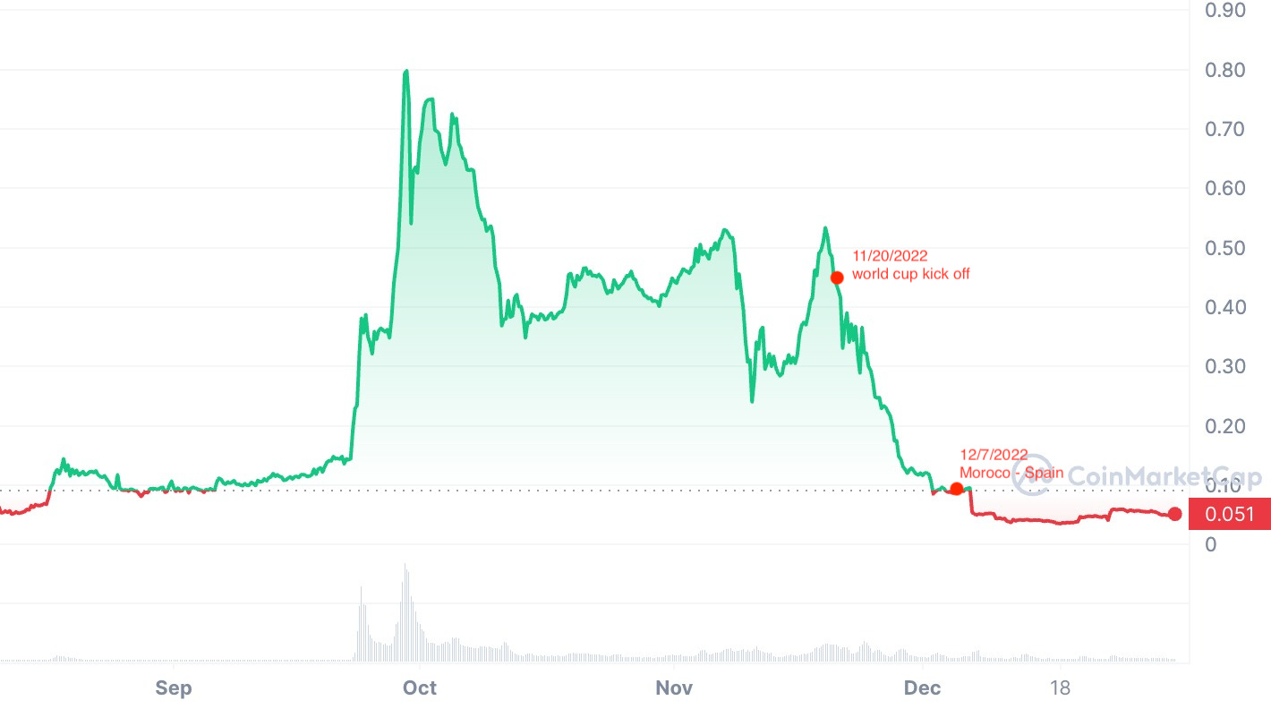 In fact, in the run-up to the 2022 World Cup, the Spanish soccer team's fan token SNFT, which was a favorite to win the tournament, saw a sharp increase in price. However, shortly after the World Cup, the price tanked. On December 6, after Spain’s defeat to Morocco, SNFT plummeted to a record low of $0.033. The Brazilian fan token also experienced a price drop in a similar fashion.
