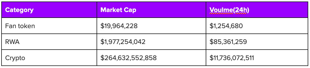 Furthermore, even when compared to the average of the top three tokens in each category, the fan token market is currently a small market. With the absence of any major sports events such as the World Cup, it is not expected that the market will expand in the short term as categories such as RWA are attracting more attention.