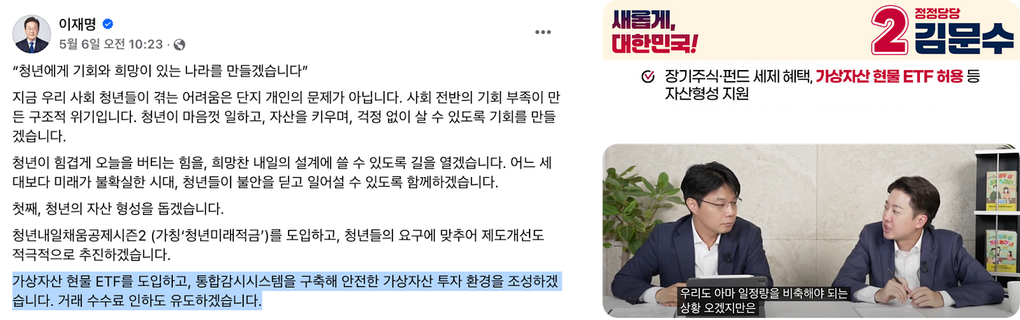 Lee Jae-myung (Democratic Party): On May 6, Lee announced via Facebook his support for spot crypto ETFs as part of a broader initiative to support youth asset formation. He also proposed lowering investment fees to improve accessibility.
