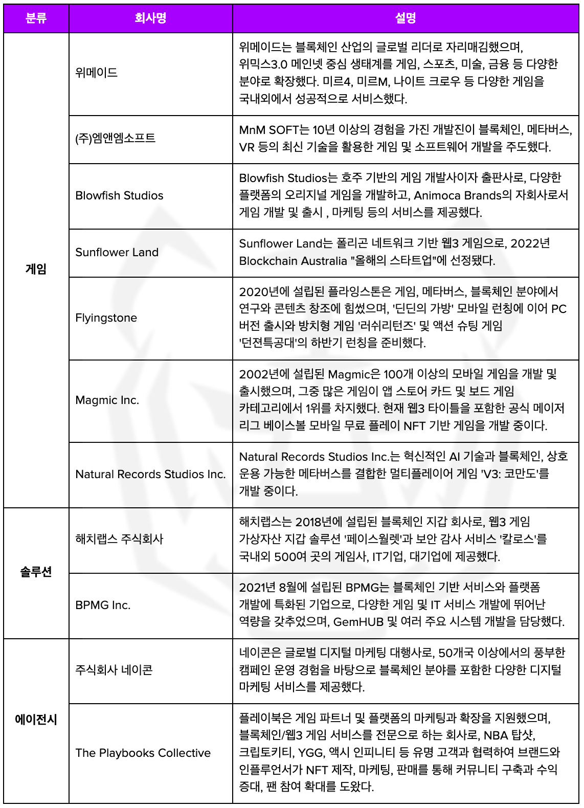 이외에도 해외 게임사 Sunflower Land, Blowfish Studio 등도 참가했다. SunFlower Land는 호주 출신의 게임 스튜디오로, 폴리곤 기반의 파밍 테마 메타버스 게임을 개발하고 있으며, Blowfish Studio는 웹2 기반 게임을 주로 개발해 온 포트폴리오를 가지고 있으나 애니모카 브랜즈의 자회사로 현재 웹3 게임 개발에도 박차를 가하고 있다.