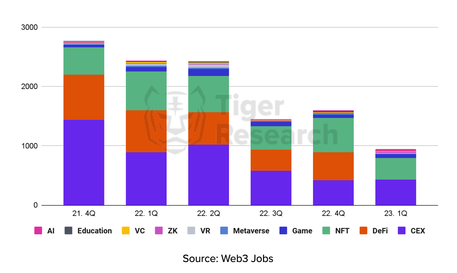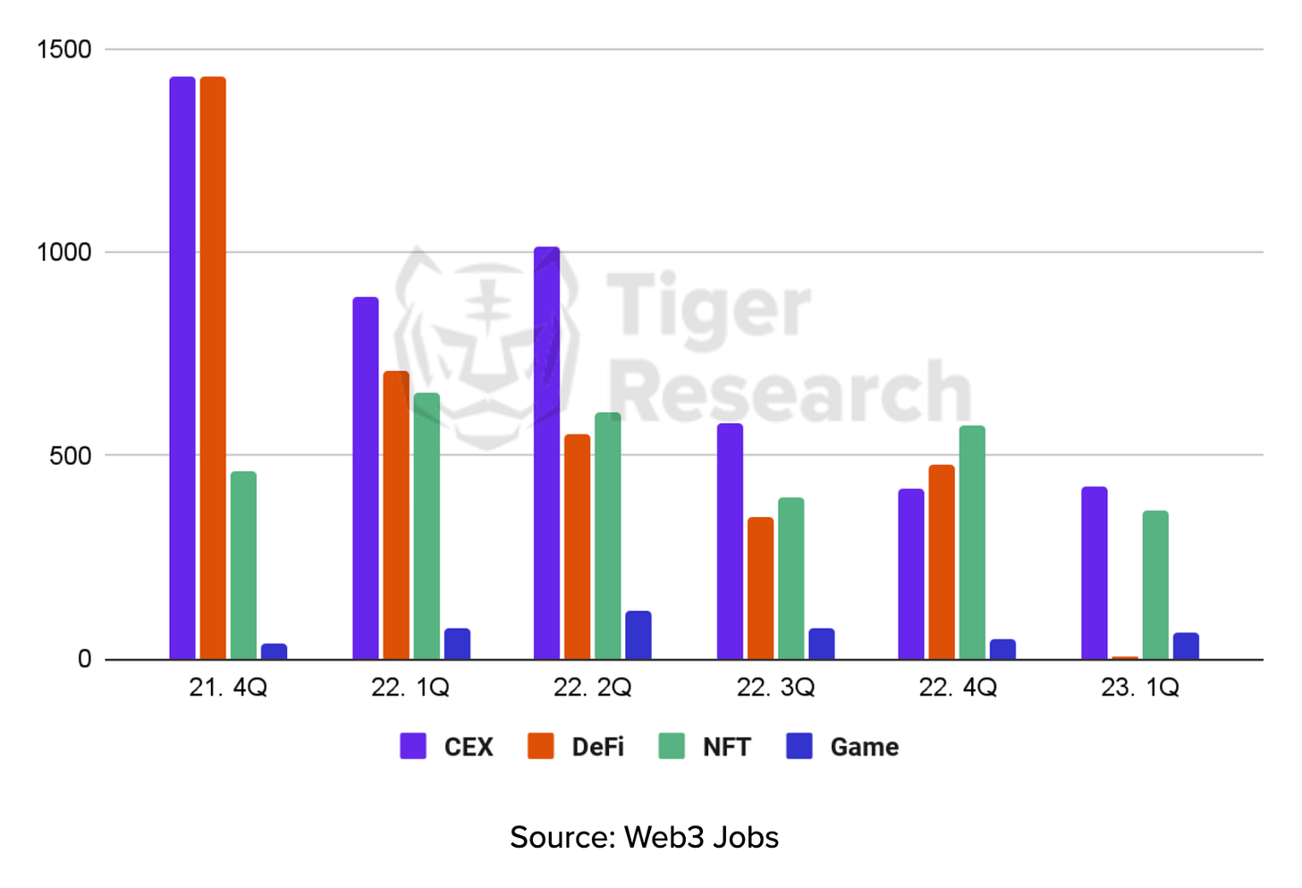 Next, the NFT sector has the second-highest number of job postings throughout the entire data collection period. The number of job postings has decreased by about 20% from the fourth quarter of 2021 to the first quarter of 2023, showing relatively stable hiring activity. Strength in NFT sector job hiring has been possible due to the entry of global Web 2.0 companies like Amazon, Starbucks, and Nike into new businesses using NFT technology, in addition to Web 3-native NFT exchanges like OpenSea, Blur, and SoRare. The data confirms that NFTs represent a "low hurdle" Web 3 field that can be applied first and most easily across various industries in relation to blockchain technology.