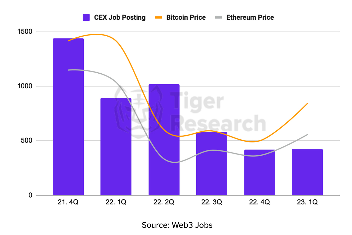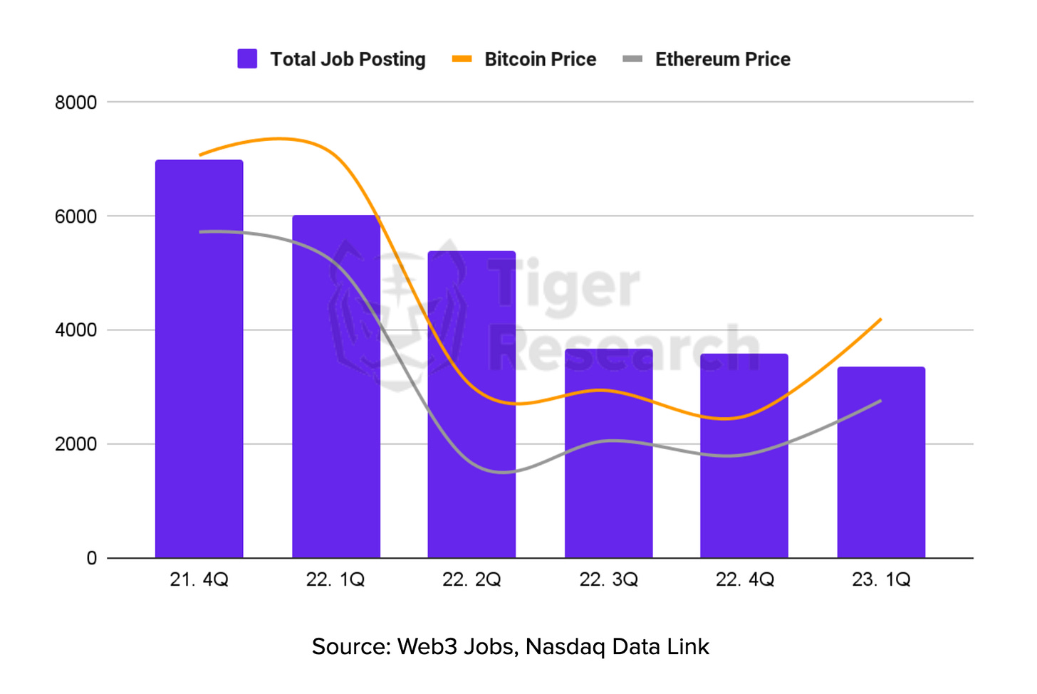 In line with the trend of structural adjustments, Web 3 job postings have also significantly decreased. Compared to the fourth quarter of 2021, known as the "crypto summer" when cryptocurrency prices peaked, the number of job postings in the first quarter of 2023 has fallen by around 52% to 3,366.