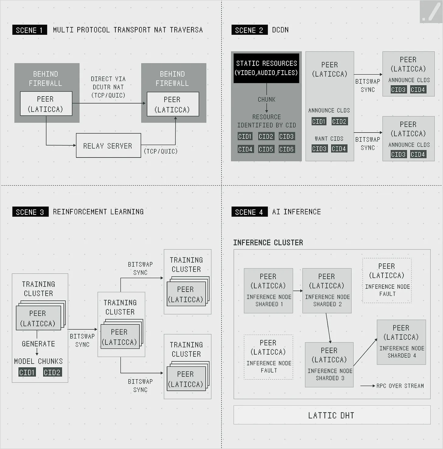Lattica在分布式环境中实现了稳定高效的数据交换。该协议支持AI训练和推理,以及分布式视频流等应用。Lattica的demo展示了它的工作原理。
