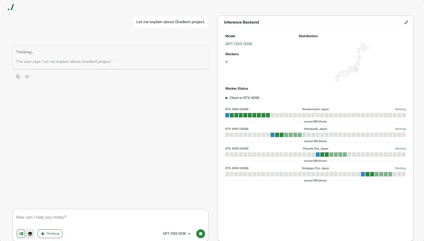 Gradient以不同的方式解决这个问题。虽然大型科技公司用数万个高性能GPU建造大规模数据中心,Gradient却将全球闲置的计算资源连接成一个分布式网络。家用电脑、闲置的办公服务器和实验室GPU作为一个巨大的集群运行。