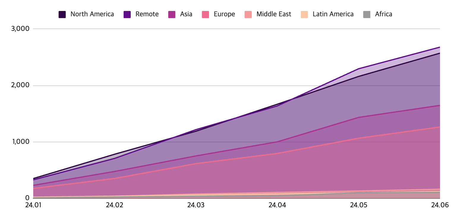 3. H1 2024 Web3 Job Postings by Continent (Monthly Cumulative)
