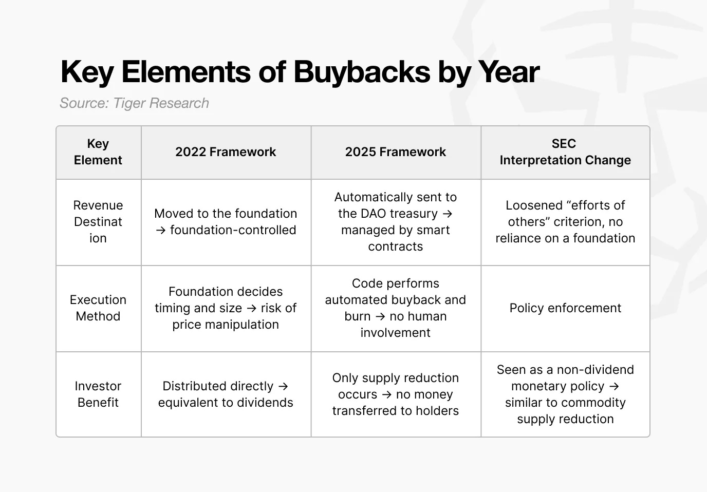 2025 年,回购与自动销毁机制结合重现。在这种模式下,收入不直接分配给代币持有者,基金会对价格或供应没有控制权,销毁过程通过算法执行。因此,该结构进一步远离了监管机构先前标记的要素。