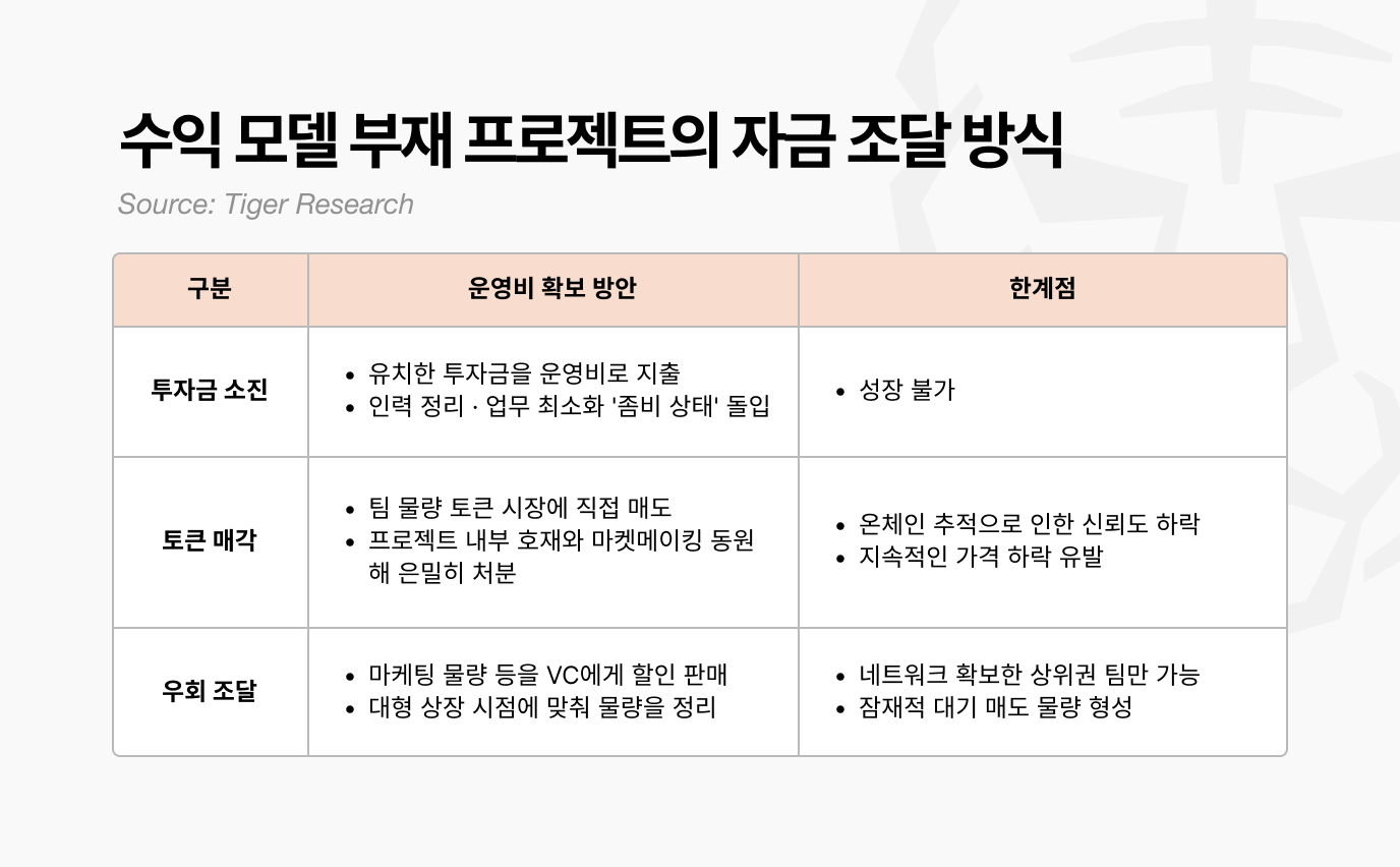그러나 이러한 구조는 어디까지나 임시방편이다. 팀이 보유한 자산과 토큰 물량에는 한계가 있기 때문이다. 결국 모든 방법을 소진한 프로젝트는 운영을 중단하거나 시장에서 소리 없이 사라지는 결말을 맞이한다.