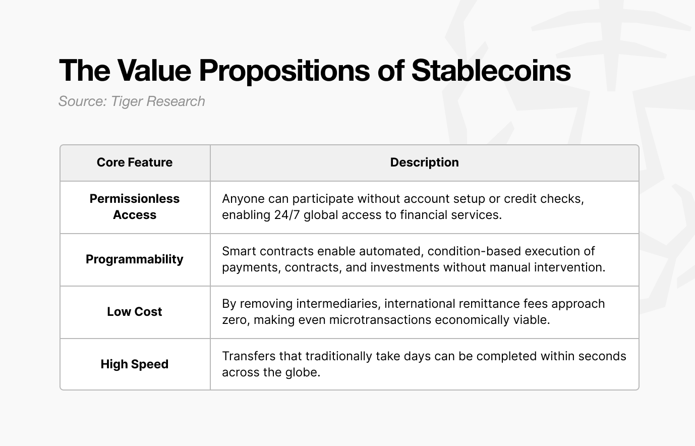 这些属性转化为四大核心价值:无需许可的访问支持全球金融包容性;可编程性实现自动化金融流程;低成本提升效率;高速率构建实时全球结算基础设施。