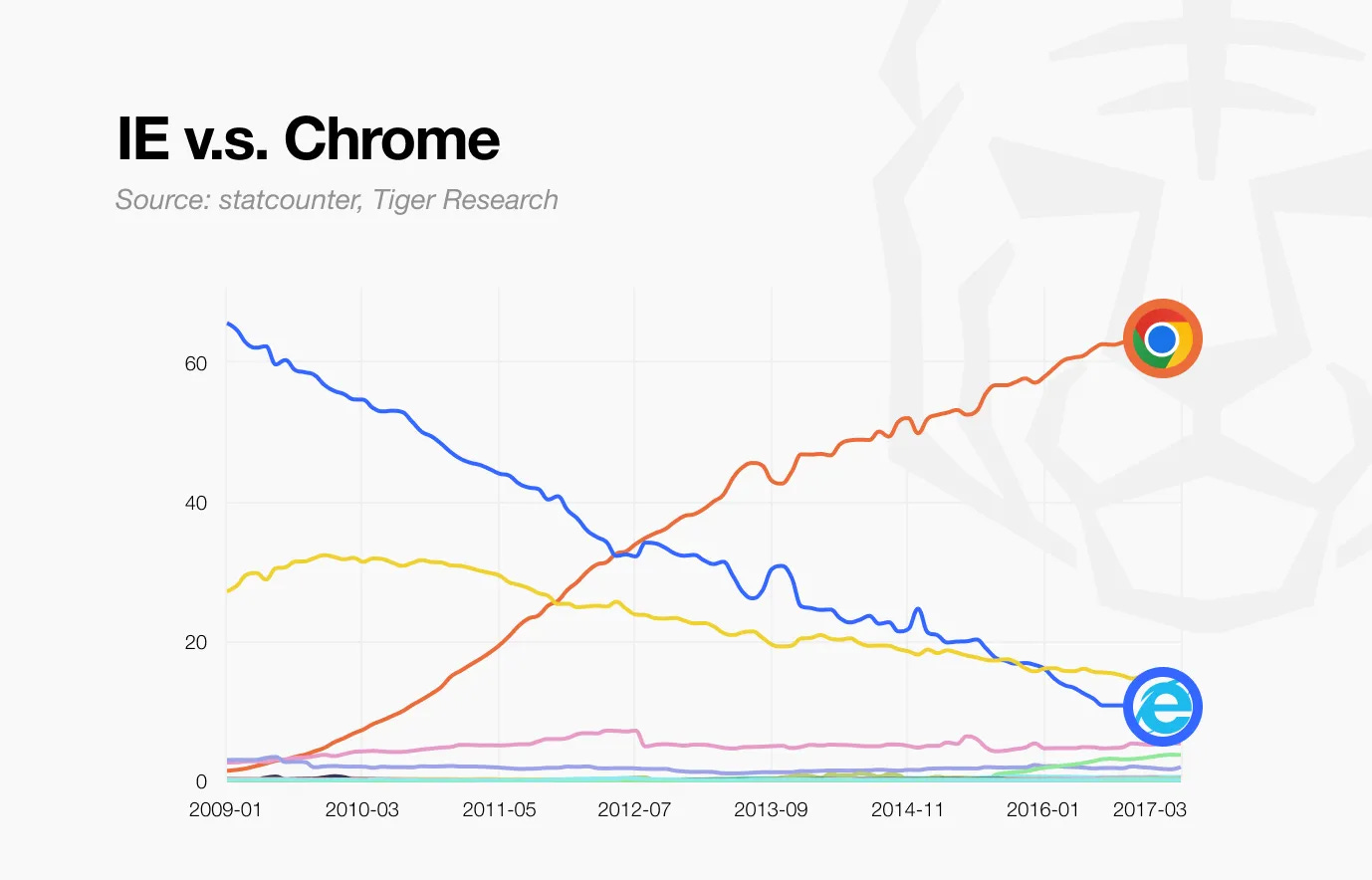 本报告由Tiger Research撰写,分析Plasma如何旨在通过革新区块链基础设施,成为"稳定币的Chrome",正如Chrome浏览器突破Internet Explorer的限制变革网页浏览体验。
