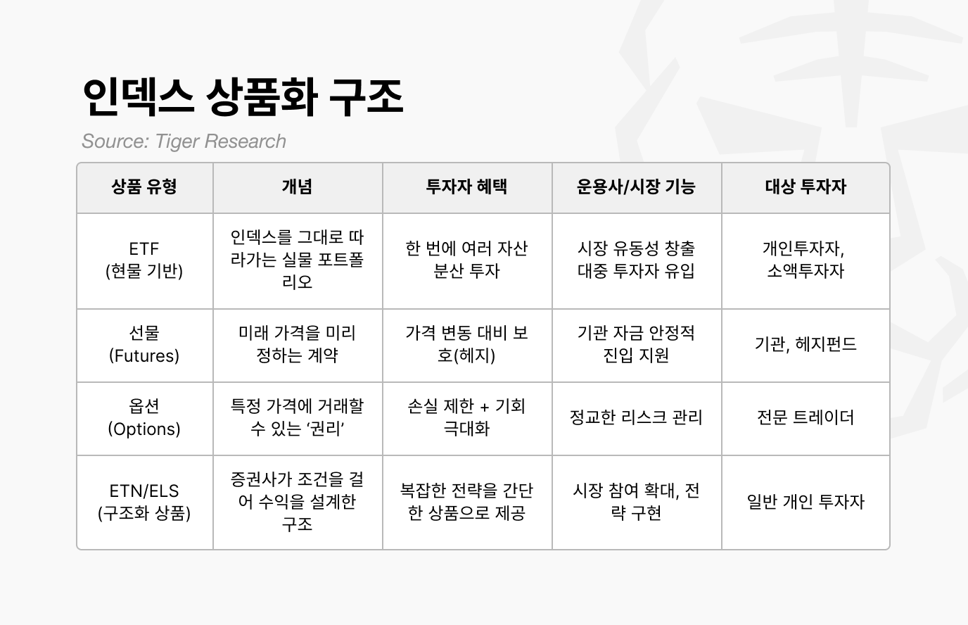 전통 금융이 시장을 근본적으로 바꾼 지점은 인덱스를 상품화한 순간부터다. 인덱스는 원래 데이터일 뿐이지만, 금융사는 이를 기반으로 ETF, 선물, 옵션 등 구조화 상품을 만들어냈다. 이러한 상품이 등장한 후부터 인덱스는 단순한 지표가 아니라 거대한 자금이 오가는 중요한 벤치마크가 됐다.