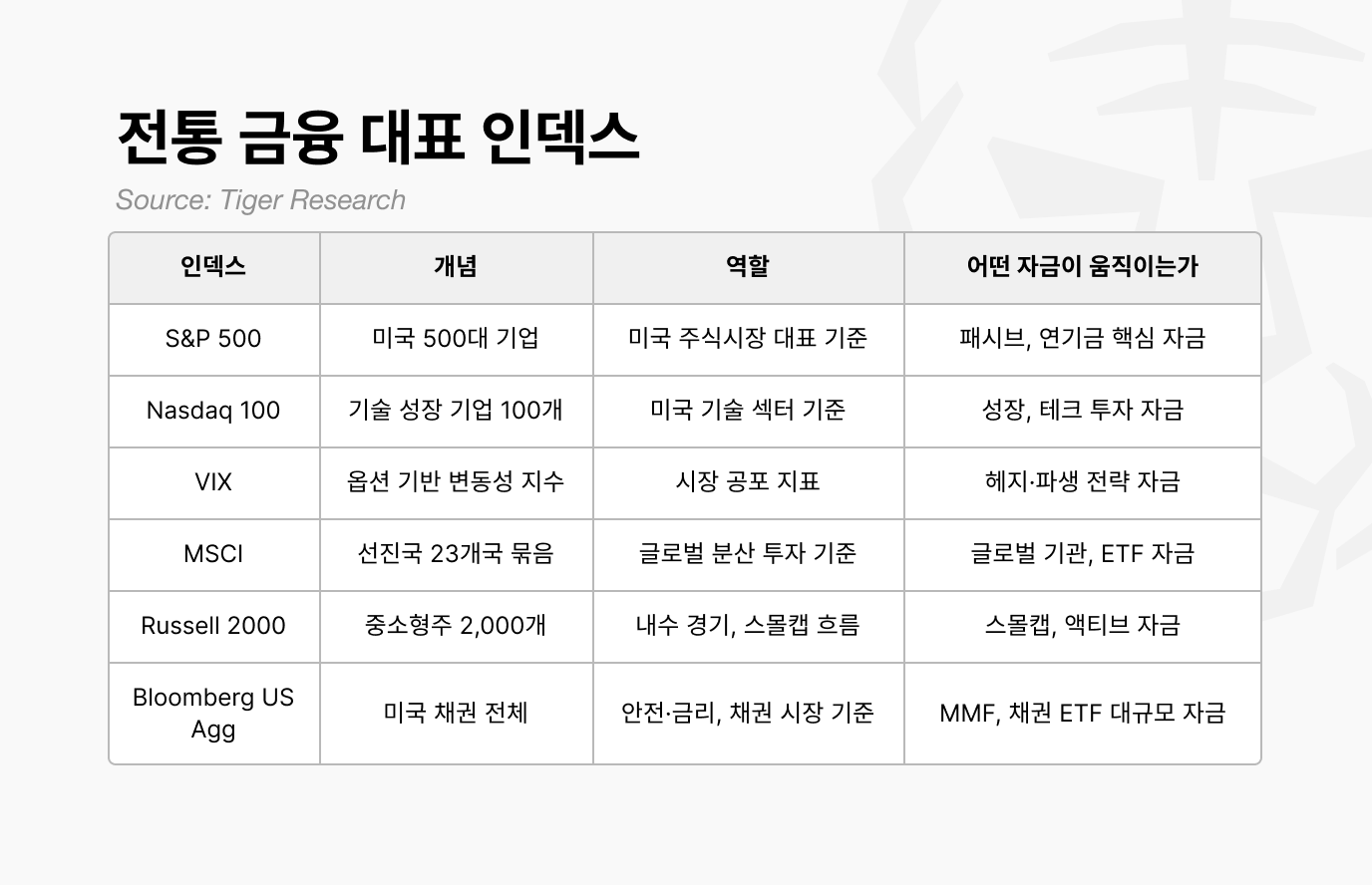 금융 시장에서 인덱스는 시장 전체 혹은 특정 섹터의 움직임을 한눈에 파악할 수 있도록 수치화한 통계 지표다. 전통 금융은 이미 표준화된 대표 인덱스를 구축했다. 아래 표는 전 세계 기관투자자들이 공통으로 사용하는 주요 인덱스다.