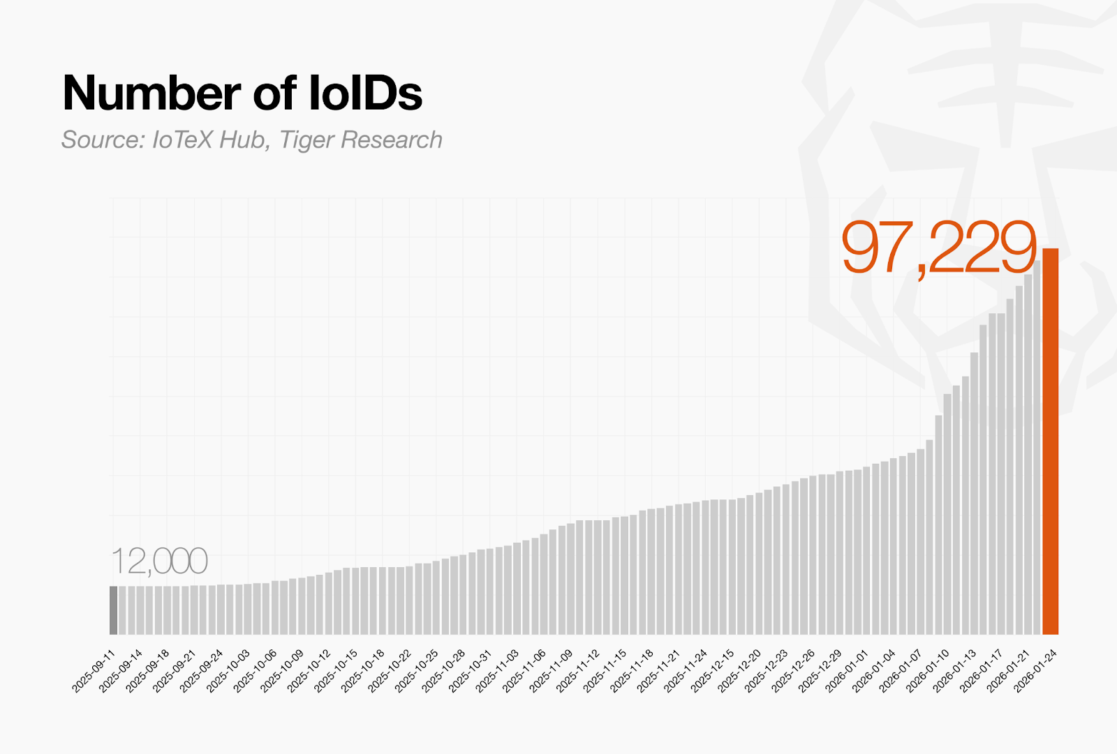 Registered ioID instances on the IoTeX network now stand at approximately 97,000. As of August 2025, the figure was around 12,000, meaning nearly eightfold growth in under six months. A signal of accelerating demand from both device manufacturers and AI agent developers building on the network.