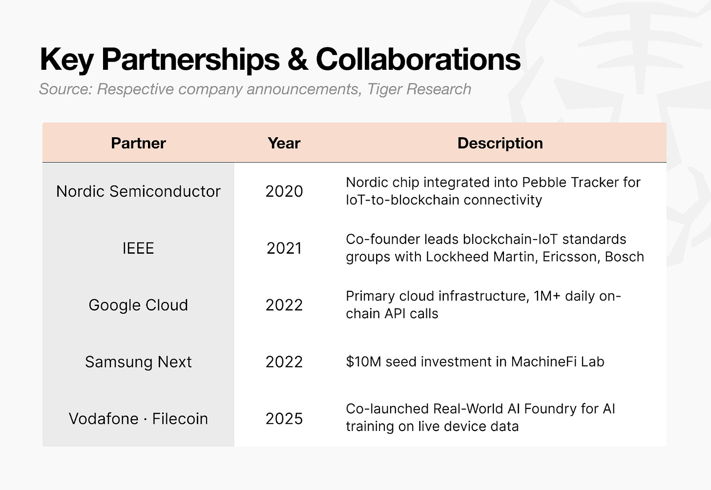 In the process, IoTeX established global partnerships with Google Cloud, Samsung Next, and Nordic Semiconductor. IoTeX also led a blockchain-IoT standards working group at IEEE, building broader industry credibility. By the end of this period, registered smart devices reached approximately 960,000 and connected DePIN projects exceeded 400.