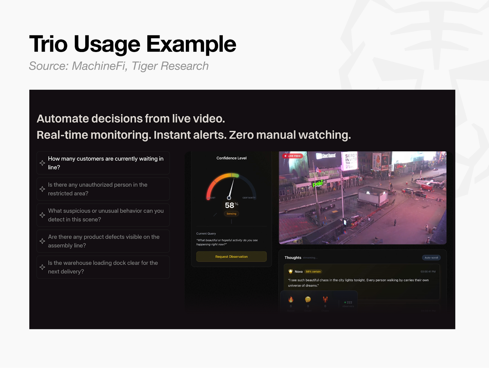 Trio is a multimodal stream agentic product. Connect a live video feed, and AI analyzes what is happening in real time, returning natural language answers. Instead of human CCTV monitoring, users ask questions like “Anyone in the restricted zone?” or “Defects on the assembly line?” and get instant judgments.