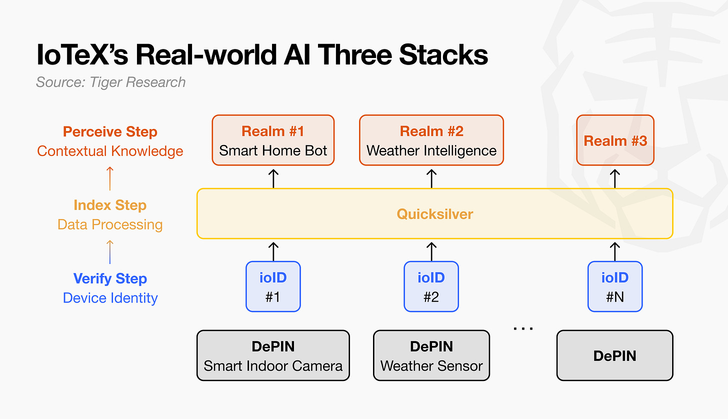 What’s needed is integrated infrastructure. Every device gets a verifiable identity. Scattered data is aggregated and delivered in AI-ready form, then organized by domain. This is precisely what IoTeX has built.