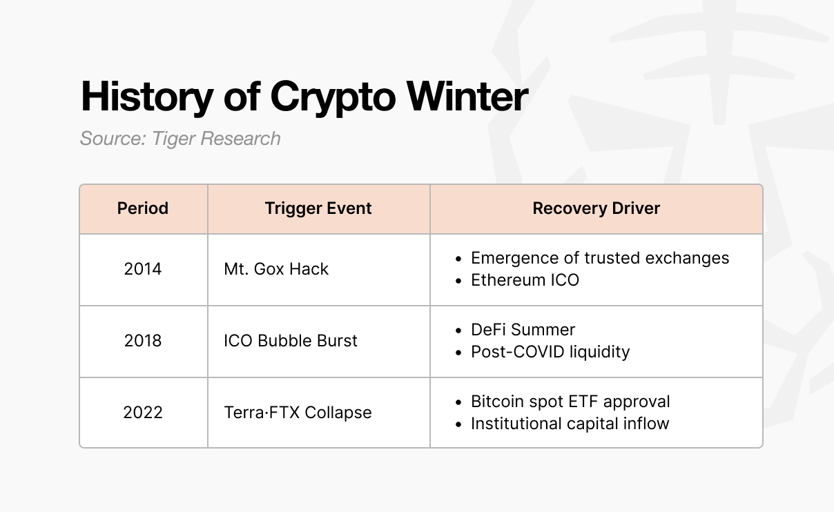 It always started with a major event. The Mt. Gox hack, ICO regulations, and the Terra-Luna collapse followed by the FTX bankruptcy. The scale and form of each event differed, but the result was the same. The entire market fell into shock.