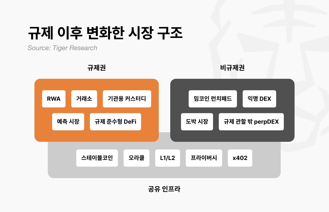 규제 이후 시장은 규제권, 비규제권, 공유 인프라 세 층으로 나뉘며 과거처럼 비트코인이 오르면 알트까지 오르는 낙수효과 사라짐.