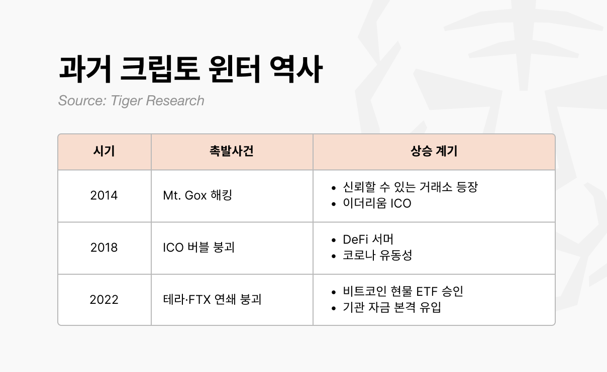 시작은 항상 대형 사건이었다. Mt. Gox 해킹, ICO 규제, 테라-루나 붕괴와 FTX 파산. 사건의 규모와 형태는 달랐지만 결과는 같았다. 시장 전체가 충격에 빠진다.