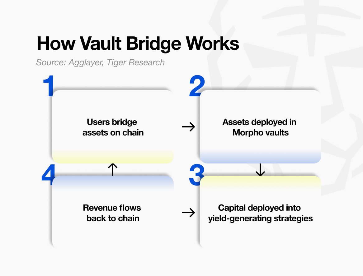 The first mechanism is Vault Bridge. When users send assets to Katana, the original assets remaining on Ethereum mainnet are deployed into lending markets to generate interest.