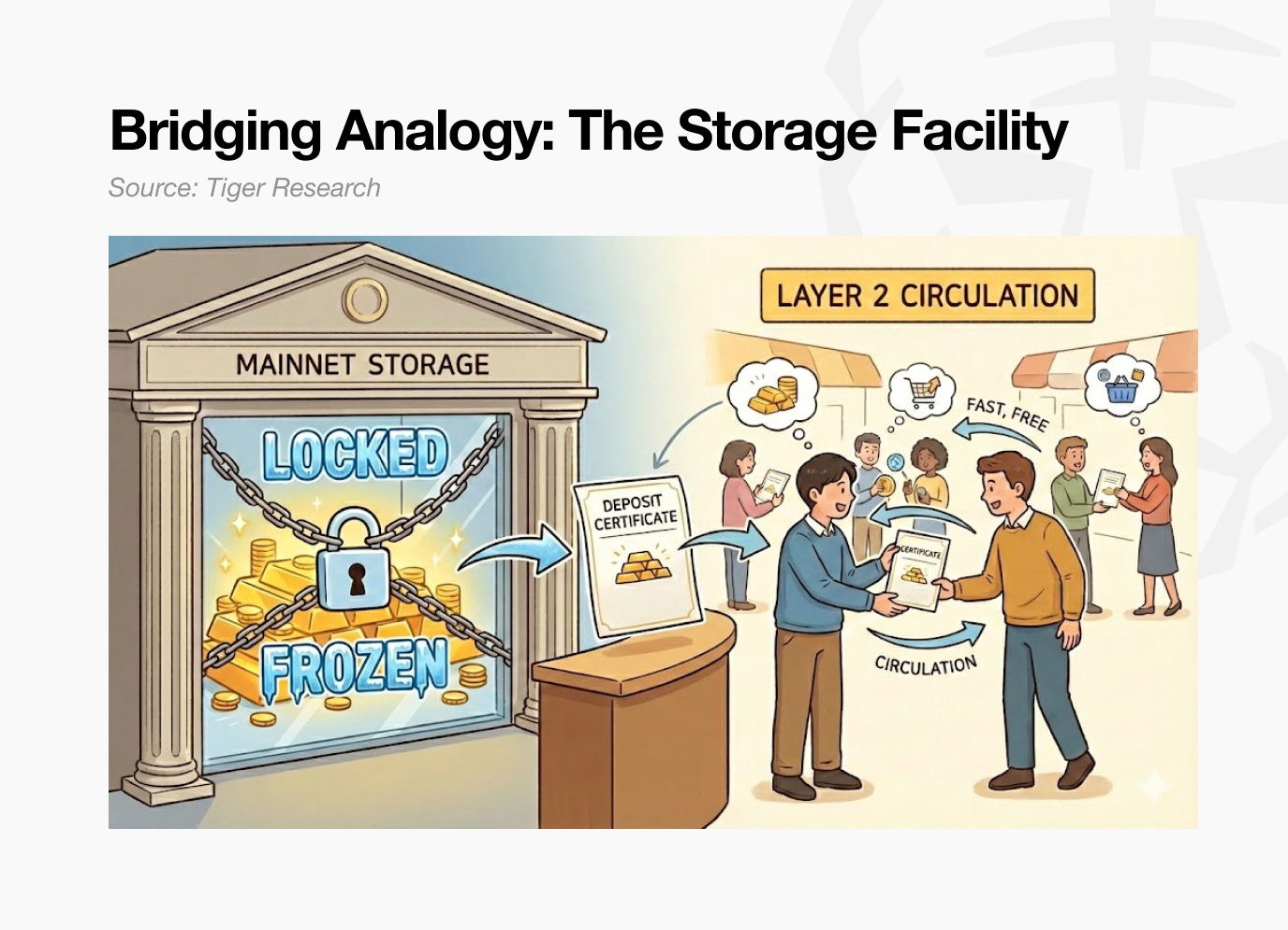 This describes how most Layer 2 bridges work. Assets held in Ethereum escrow contracts generate no yield. They wait passively until users withdraw them back to mainnet.