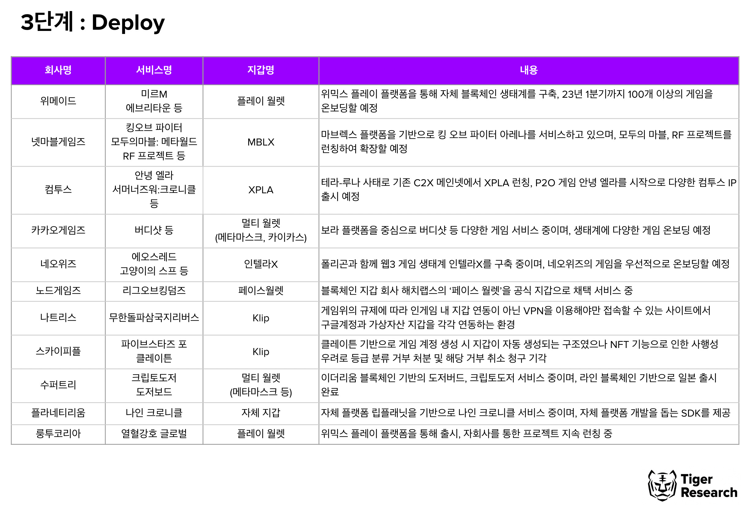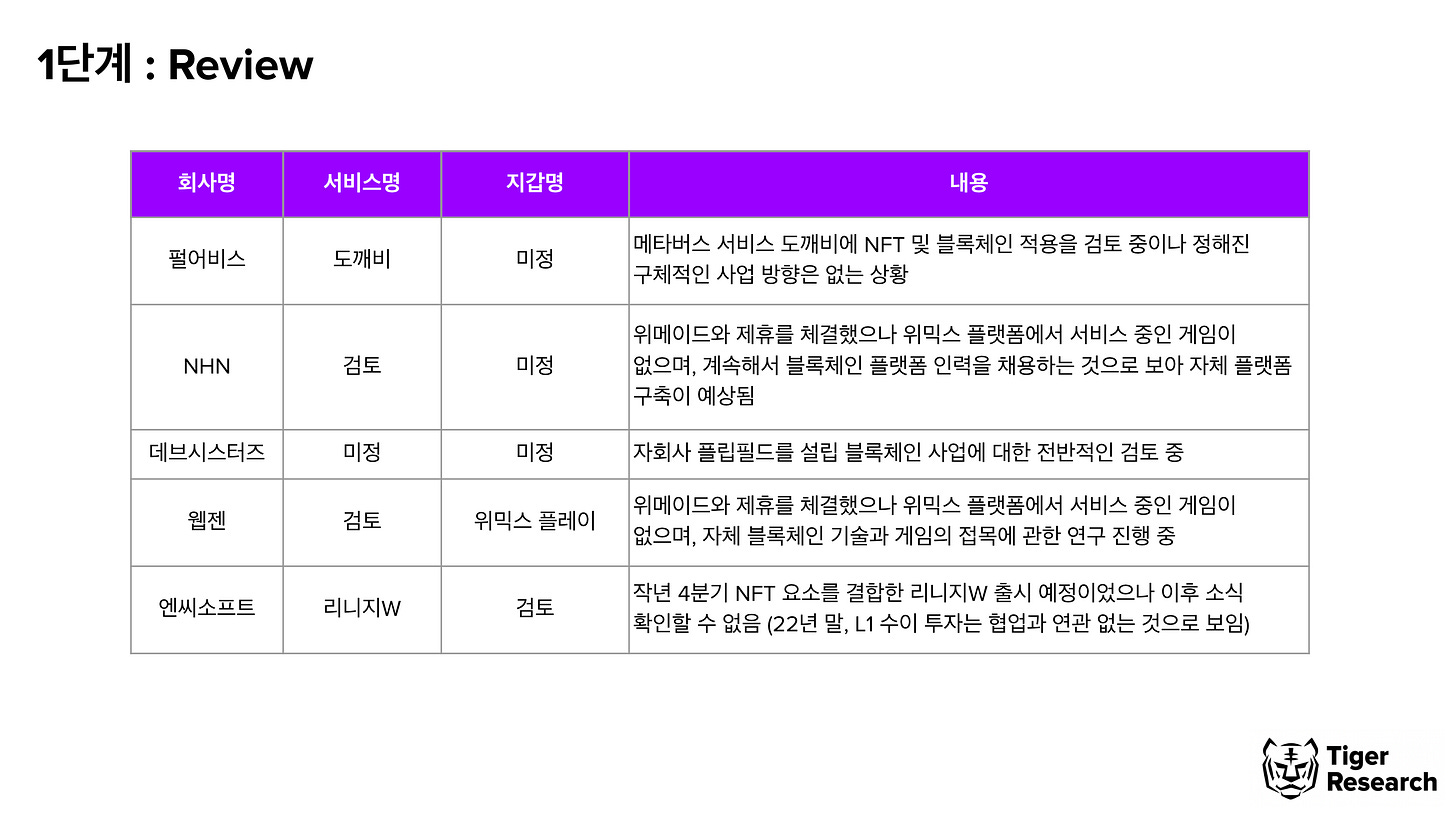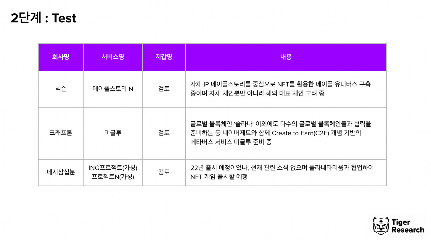 1단계에 해당하는 게임사들은 MOU를 이미 맺었으나 하나의 플랫폼에 종속되는 문제를 해결하기 위해 자체 플랫폼을 만들고자 하는 모습을 보인다. 특히, NHN과 웹젠은 위메이드와 MOU를 맺었으나 주요 IP는 자체 블록체인 플랫폼을 통해 출시할 것으로 예상된다.