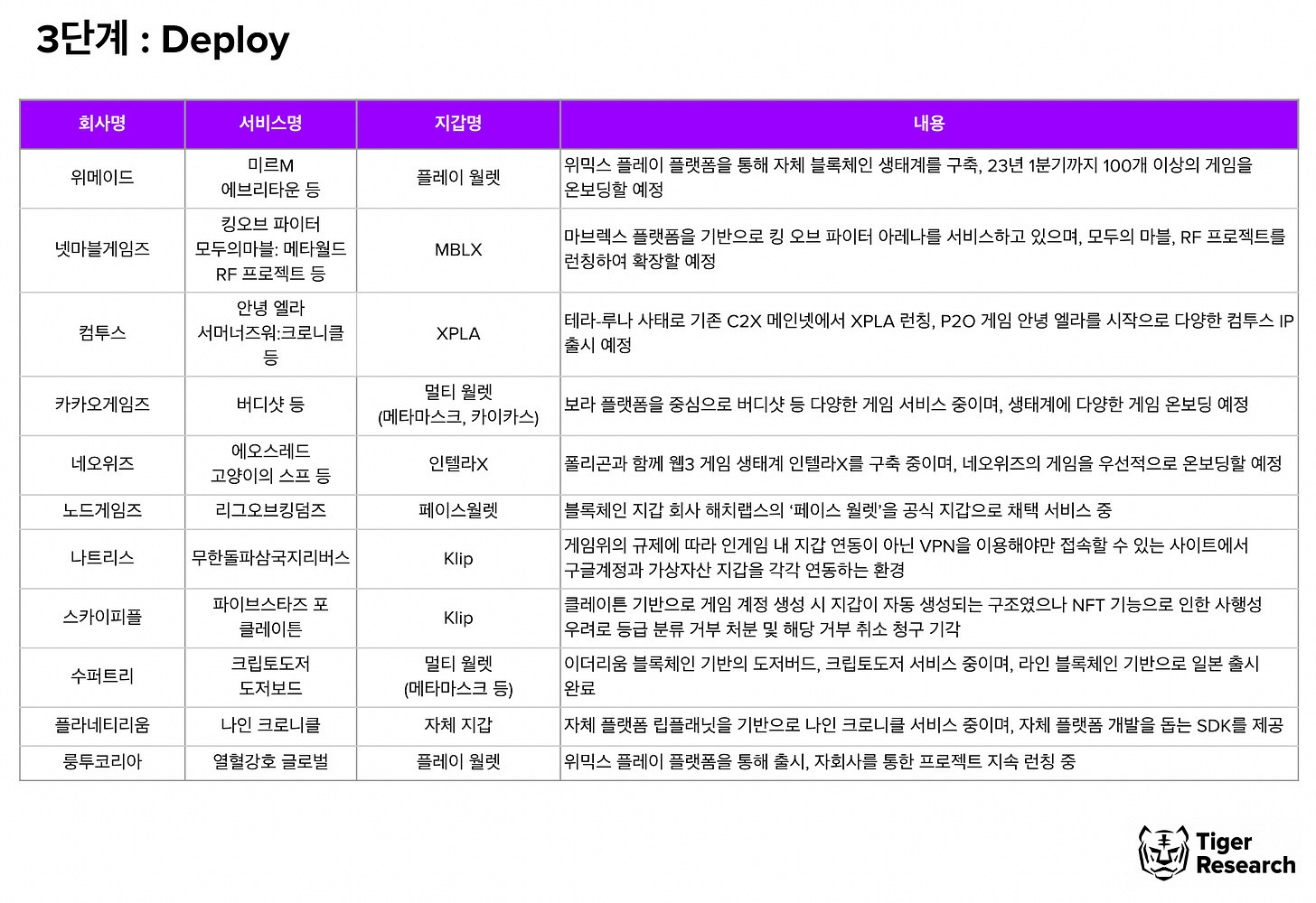 3단계에 해당하는 게임사 중 위메이드, 넷마블게임즈, 컴투스, 카카오게임즈, 네오위즈는 자체 플랫폼을 발빠르게 런칭해 서비스하고 있다. 재밌는 점은 네오위즈는 인텔라X 외에 네오핀 지갑도 서비스하고 있는데 네오핀은 금융에 집중하고 인텔라X는 게임에 집중한 분할된 구조를 갖고 있다.