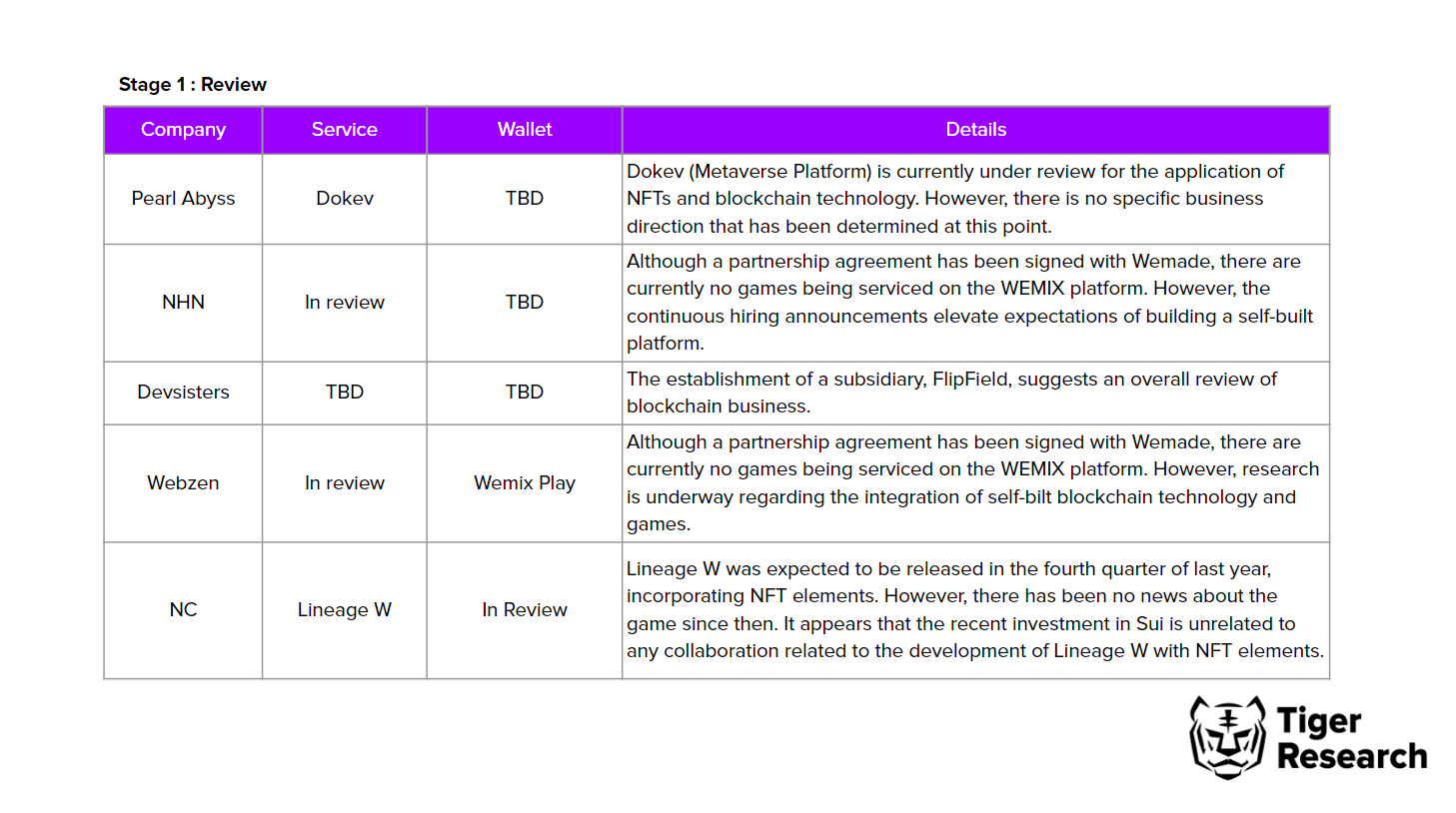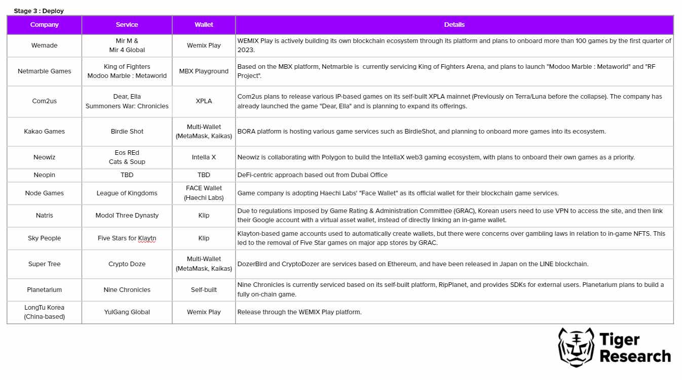 Game developers in the third stage, such as Wemade, Netmarble, Com2us, Kakao Games, and Neowiz, have already launched their own platforms and are offering blockchain services - independently. It's interesting to note that Neowiz is not only offering its IntellaX platform, but also its Neopin wallet, which has a focus on Defi features. This split structure allows for separate focus on both gaming and finance.