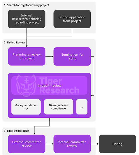 Currently, the five major exchanges in Korea operate a self-regulatory organization called the Digital Assets eXchange Alliance (DAXA) for the purpose of establishing voluntary regulations regarding investor protection and listing regulations. The organization has defined the essential tasks that each member company must perform when reviewing new projects, mainly focusing on 1) investor protection through risk assessment of virtual assets, 2) whether the virtual asset under review is a security, and 3) the possibility of money laundering. However, these are the common minimum criteria, and each exchange may have additional criteria or procedures.