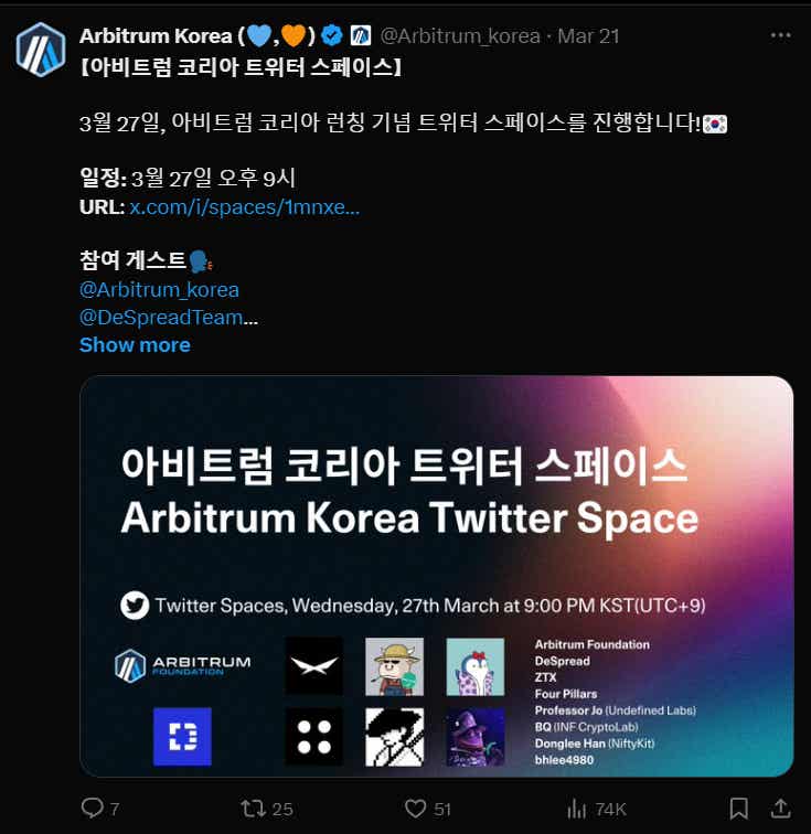 Arbitrum, for example, has established a local community called Arbitrum Korea to facilitate its expansion into South Korea. Arbitrum Korea actively engages ambassadors and local partners to strengthen its presence. These ambassadors play a crucial role by translating Arbitrum's ecosystem updates into Korean and distributing them across key channels. They also organize events, such as Twitter Spaces with prominent figures in Korea, to boost awareness and engagement within the Korean market.