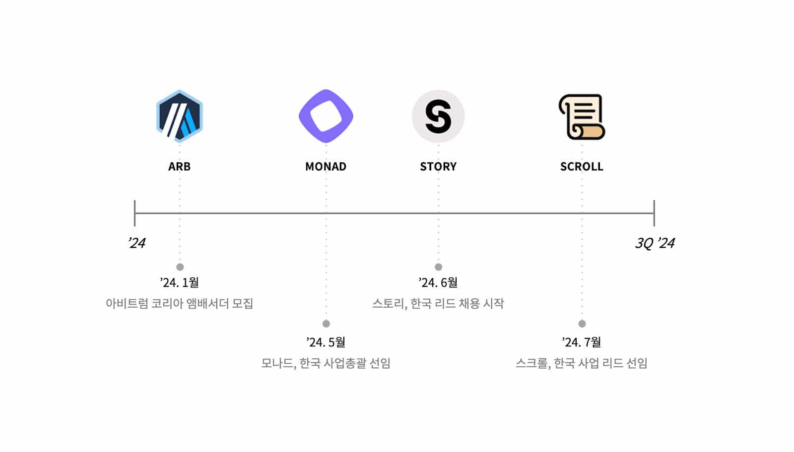 올해도 아비트럼, 모나드, 스토리, 스크롤 등 메인넷 프로젝트들이 한국 시장을 향해 빠르게 확장하고 있으며, 이들은 커뮤니티, 교육, 파트너십을 활용해 저마다의 방식으로 생태계를 넓혀 나가고 있다.