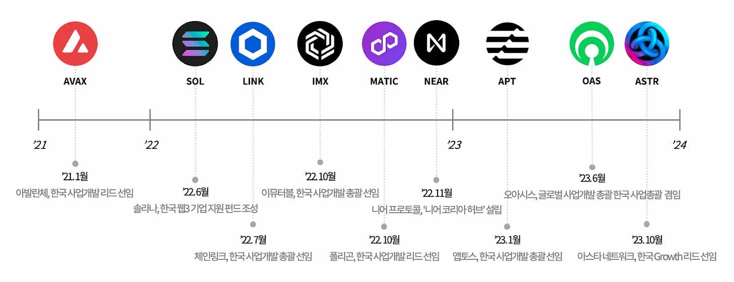 글로벌 블록체인 메인넷들은 2022년 이후로 본격적으로 한국 시장에 진출하기 위해 한국 담당자를 채용하고 한국 기업들과 파트너십을 맺는 모습을 보였다. 2021년 한국 사업개발 리드를 선임하여 본격적인 한국 진출을 알린 아발란체(Avalanche)부터 솔라나(Solana), 폴리곤(Polygon), 앱토스(Aptos), 아스타(Astar)와 같이 글로벌에서 주목받는 대규모 블록체인들이 한국 시장에 잇달아 진출했다.