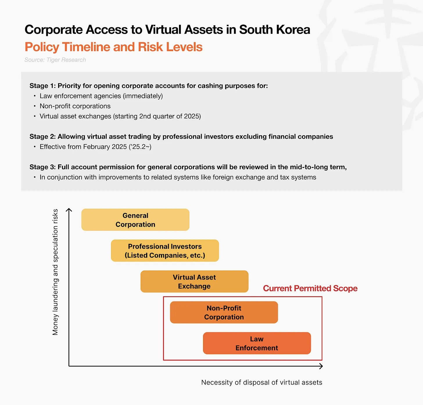 1단계에 해당하는 법집행기관(검찰, 국세청, 지자체 등)의 경우 이미 2024년 11월부터 계좌발급이 진행됐으며 몰수 및 압류된 가상자산의 현금화가 가능해졌으며, 비영리법인과 가상자산거래소의 경우, 2025년 2분기부터 계좌발급이 시작될 예정이다. 이후 2단계로 더욱 주목할 만한 변화는 상장사와 전문투자자 법인을 대상으로 2025년 하반기부터 가상자산 매매가 허용된다.