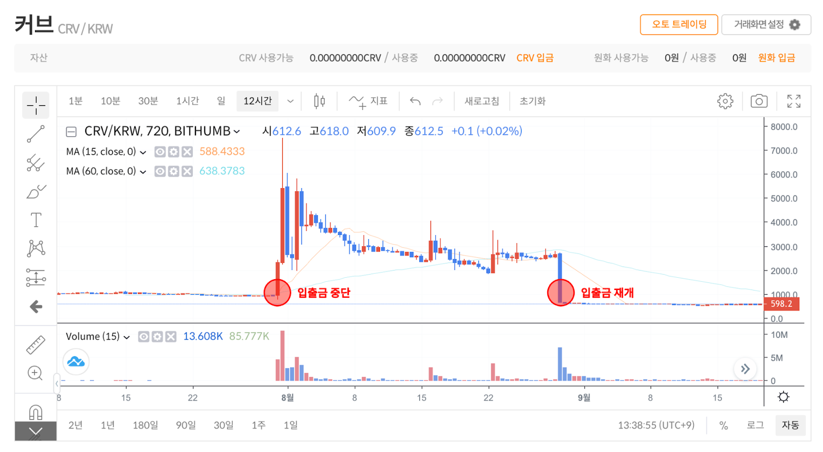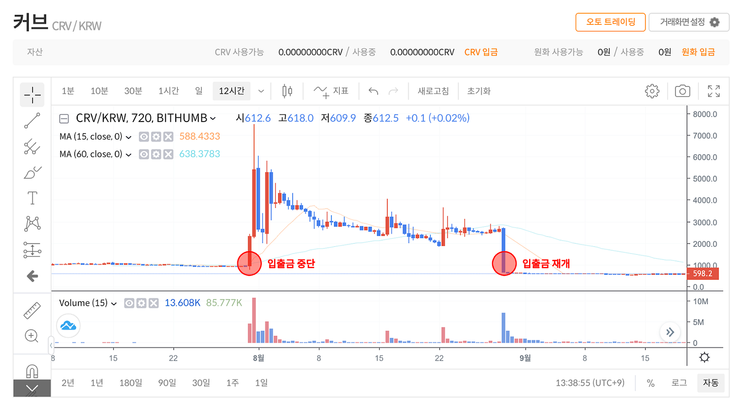 2023년 8월 커브파이낸스 내 취약점 발생을 이유로, 국내 거래소 업비트, 빗썸, 코인원에서 안정성 확보 시점까지 입출금 서비스를 일시 중단하였다. 해당 기간동안 커브(CRV)의 가격은 가파른 상승을 이루며, 소위 ‘가두리 펌핑' 현상이 발생하였다. 각 거래소별 기간 내 최대 고점을 확인해 보면, 빗썸 7,500원, 코인원 3,928원, 업비트 1,300원으로 모두 글로벌 평균 가격인 800원 대비 월등히 높은 것을 확인할 수 있다. 빗썸의 경우 그 차이가 상당한데, 글로벌 평균 가격 대비 약 938% 정도의 급격한 가격 상승이 있었고, 입출금 재개 이후 즉시 폭락하며 평균 가격으로 복귀하였다.