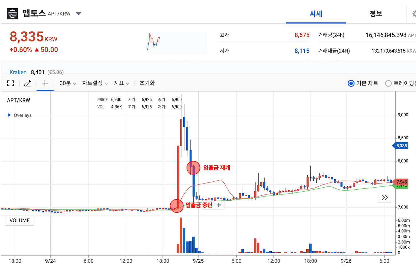 2023년 9월, 업비트 거래소에서 앱토스(Aptos) 오입금 사고 발생 이후, 해당 거래소 내 입출금이 반나절 동안 중단되며, 순간적으로 가격이 급상승한 사례도 있었다. 해당 건도, 글로벌 거래소의 평균 가격 흐름과는 무관하게 발생하였으며, 평균 가격 대비 약 72% 상승해 최대 9,465원까지 가파른 상승세를 보여주었다.
