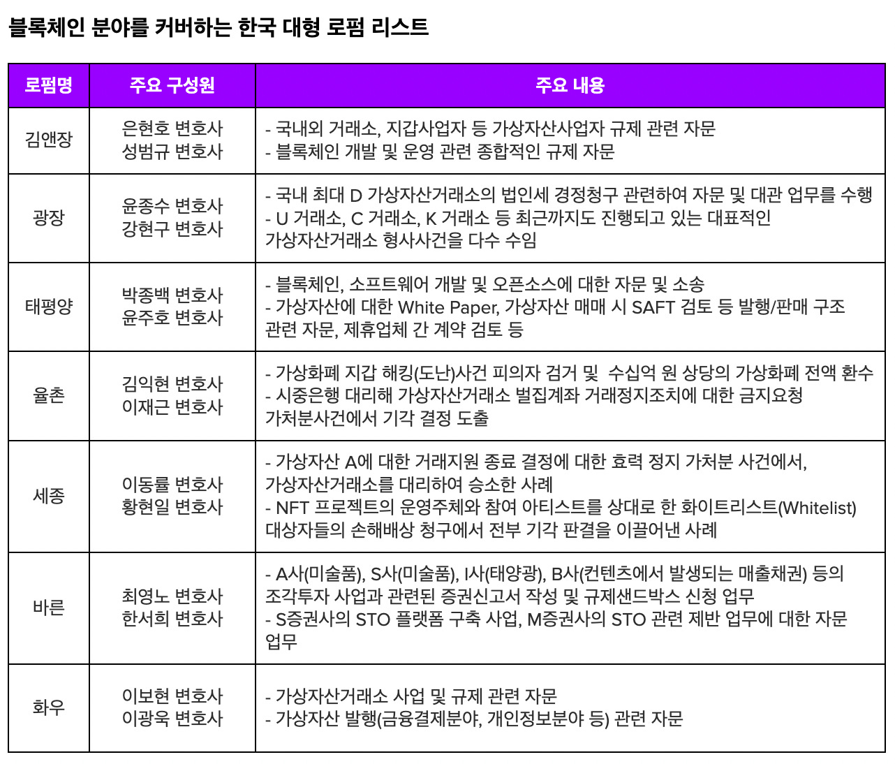 한국의 주요 로펌들은 블록체인과 가상자산에 대한 전문 산업 분야로서 전담 조직을 구축하고, 이 분야의 법률적, 기술적 변화에 대응하기 위해 다양한 자문과 소송 업무를 수행하여 다양한 부문에서 활동 영역을 넓히고자 하고 있다.
