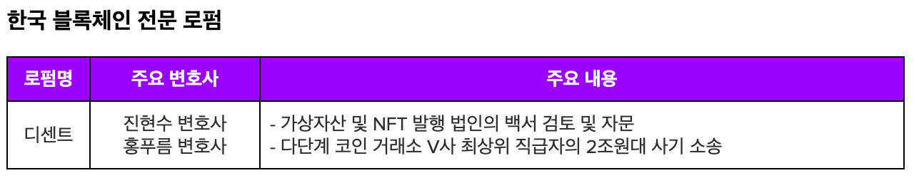 또한 블록체인을 타겟한 전문 로펌도 점차 나오고 있는데, 법무법인 디센트가 대표적이다. 다른 업무도 수행하지만, 가상자산 및 스타트업 전문 로펌으로 시작한만큼 블록체인 분야에 있어서 법률적인 이해뿐만 아니라 기술적인 이해가 깊어 빠르게 변화하는 웹3 시장에 대한 전문적인 자문이 가능할 것으로 예상된다.