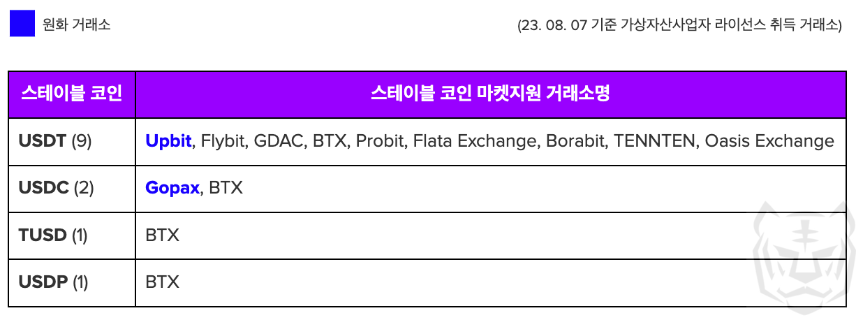 두 번째로, 가상자산 구매를 위한 기축통화로써의 매력도가 낮다는 이유이다. 국내는 원화 거래소를 통해 쉽게 가상자산을 매수/매도할 수 있으며, 원화 거래소가 제도권 안에 있어 비교적 안전하다는 인식이 있다. 이에 스테이블 코인이 아닌 원화를 통한 거래가 더 활발할 수밖에 없다. 실제로 국내 가상화폐 거래금액 중, 원화 거래소가 차지하는 비율은 99.4%에 달하며, BTC/USDT/USDC 등을 통한 가상화폐 거래 비중은 0.6%에 그칠 정도로 극심한 차이를 보이고 있다. 따라서 원화를 통해 거래가 가능한 국내 시장 특성상 스테이블 코인의 입지가 좁을 수밖에 없다.