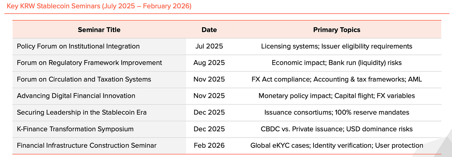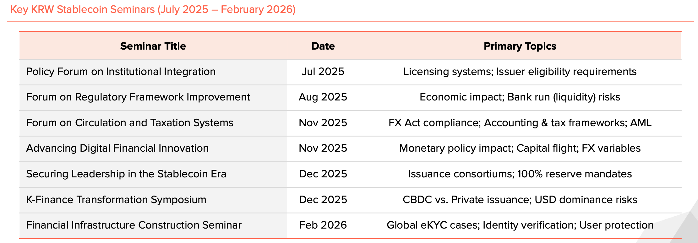 Between July 2025 and February 2026, the National Assembly and academia convened over seven major forums. Discussions focused predominantly on issuing entities, reserve asset requirements, and oversight authority.
